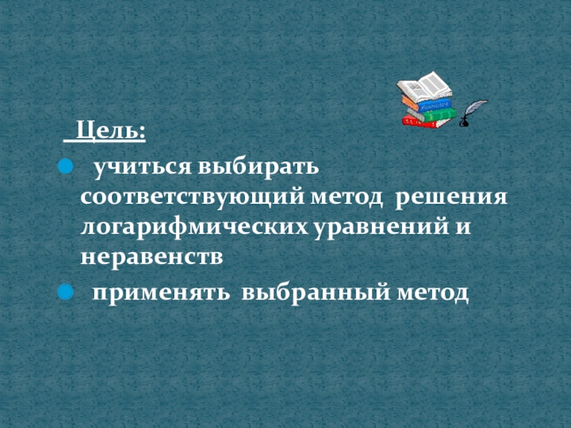 Цель: учиться выбирать соответствующий метод решения логарифмических уравнений и неравенств применять выбранный метод