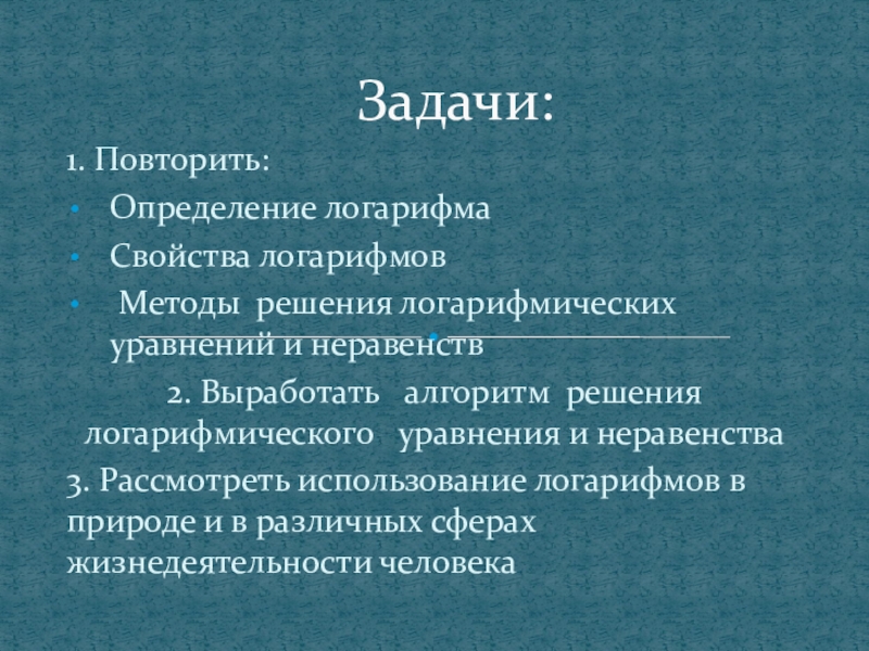 1. Повторить:Определение логарифма Свойства логарифмов Методы решения логарифмических уравнений и неравенств2. Выработать  алгоритм решения  логарифмического