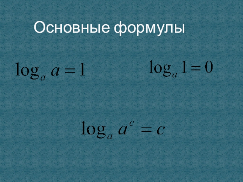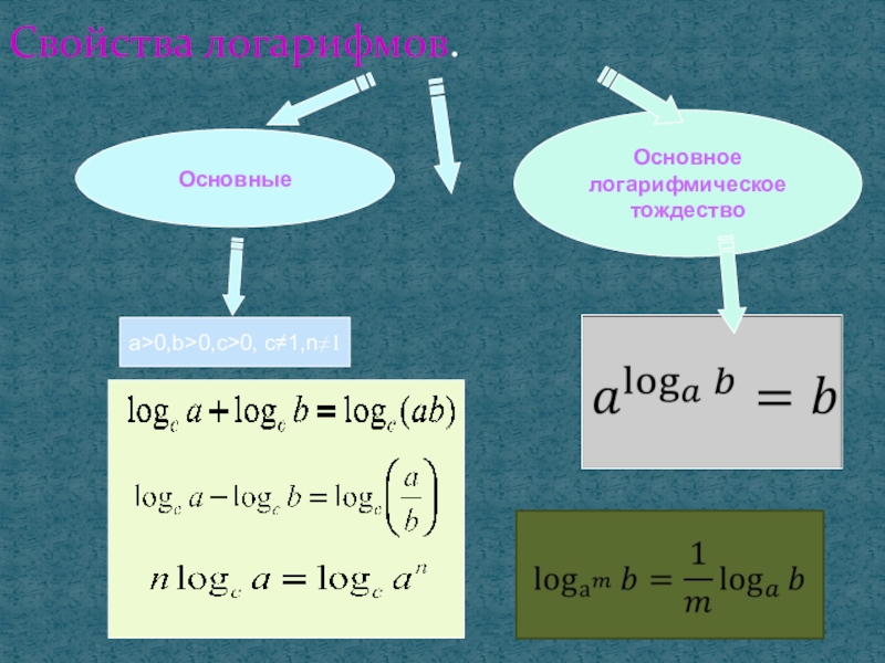 Свойства логарифмов.	a>0,b>0,c>0, c≠1,n≠1Основное логарифмическоетождествоОсновные