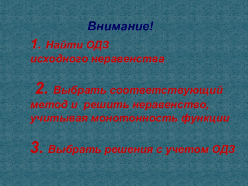 Внимание!3. Выбрать решения с учетом ОДЗ1. Найти ОДЗ исходного неравенства 2. Выбрать соответствующий метод и решить неравенство,