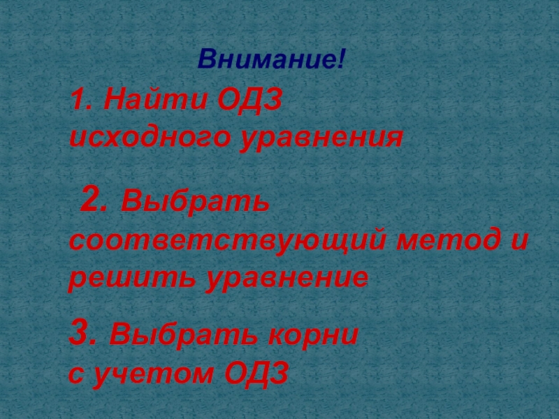 Внимание!3. Выбрать корни с учетом ОДЗ1. Найти ОДЗ исходного уравнения 2. Выбрать соответствующий метод и решить уравнение