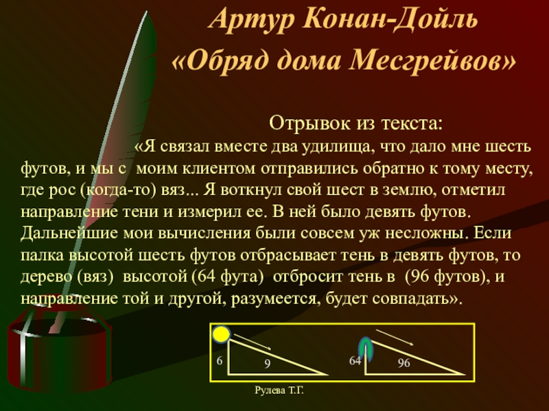 «0ба горизонтальных расстояния были измерены: меньшее равнялось 15 футам, большее - 500 футам. По окончании измерений инженер составил следующую запись: 15:500 = 10:х, 500×10 = 5000, 5000:15 = 333,3.