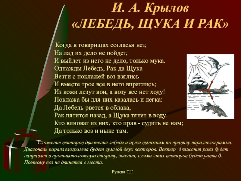 Сложение векторов движения лебедя и щуки выполним по правилу параллелограмма. Диагональ параллелограмма будет суммой двух векторов. Вектор движения рака будет направлен в противоположную сторону, значит, сумма этих векторов будет равна 0.
