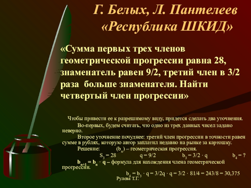 геометрической прогрессии равна 28, знаменатель равен 9/2, третий член в 3/2 раза больше знаменателя. Найти четвертый член прогрессии»