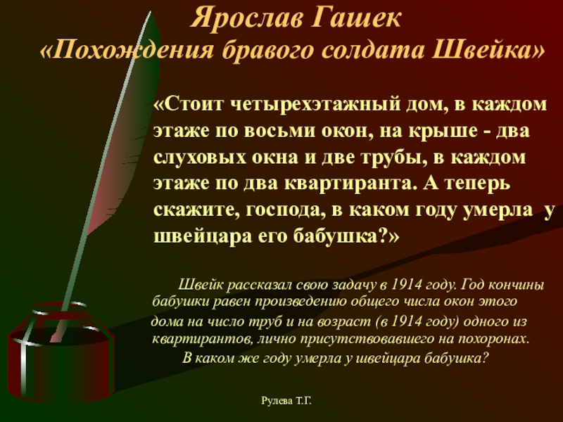 «Стоит четырехэтажный дом, в каждом этаже по восьми окон, на крыше - два слуховых окна и две трубы, в каждом этаже по два квартиранта. А теперь скажите, господа, в каком году умерла у швейцара его бабушка?»