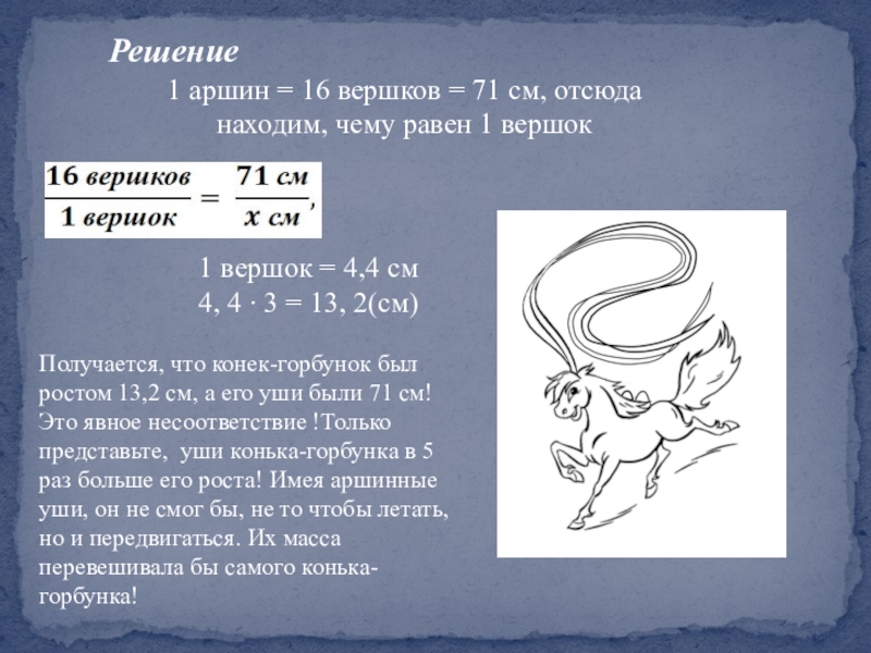 Получается, что конек-горбунок был ростом 13,2 см, а его уши были 71 см! Это явное несоответствие !Только представьте, уши конька-горбунка в 5 раз больше его роста! Имея аршинные уши, он не смог бы, не то чтобы летать, но и передвигаться. Их масса перевешивала бы самого конька-горбунка!