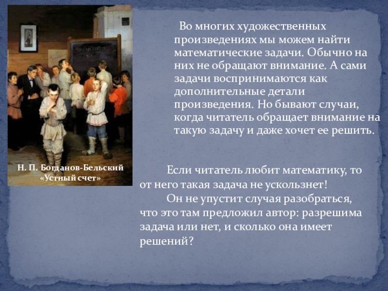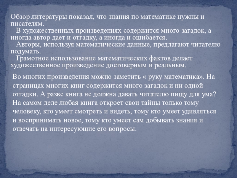 Во многих произведения можно заметить « руку математика». На страницах многих книг содержится много загадок и ни одной отгадки. А разве книга не должна давать читателю пищу для ума? На самом деле любая книга откроет свои тайны только тому человеку, кто умеет смотреть и видеть, тому кто умеет удивляться и воспринимать новое, тому кто умеет сам добывать знания и отвечать на интересующие его вопросы.