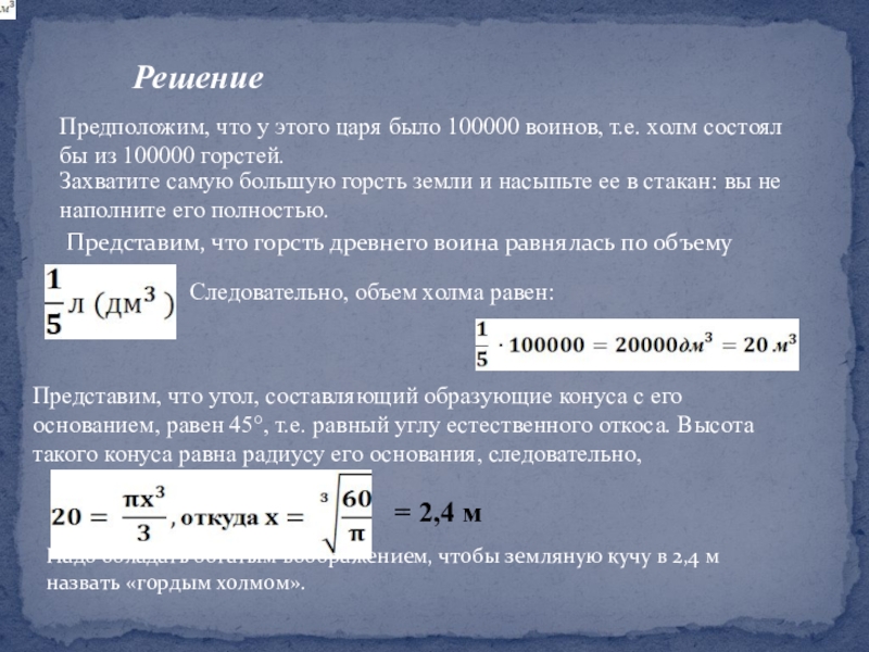 Представим, что угол, составляющий образующие конуса с его основанием, равен 45°, т.е. равный углу естественного откоса. Высота такого конуса равна радиусу его основания, следовательно,