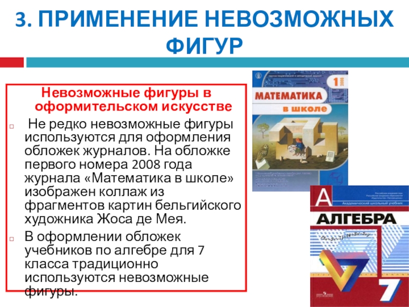используются для оформления обложек журналов. На обложке первого номера 2008 года журнала «Математика в школе» изображен коллаж из фрагментов картин бельгийского художника Жоса де Мея.