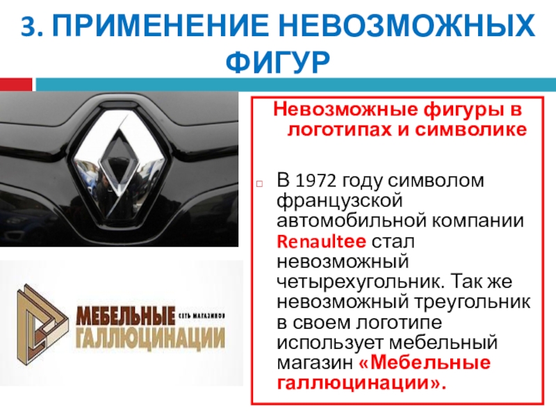 символом французской автомобильной компании Renaultее стал невозможный четырехугольник. Так же невозможный треугольник в своем логотипе использует мебельный магазин «Мебельные галлюцинации».