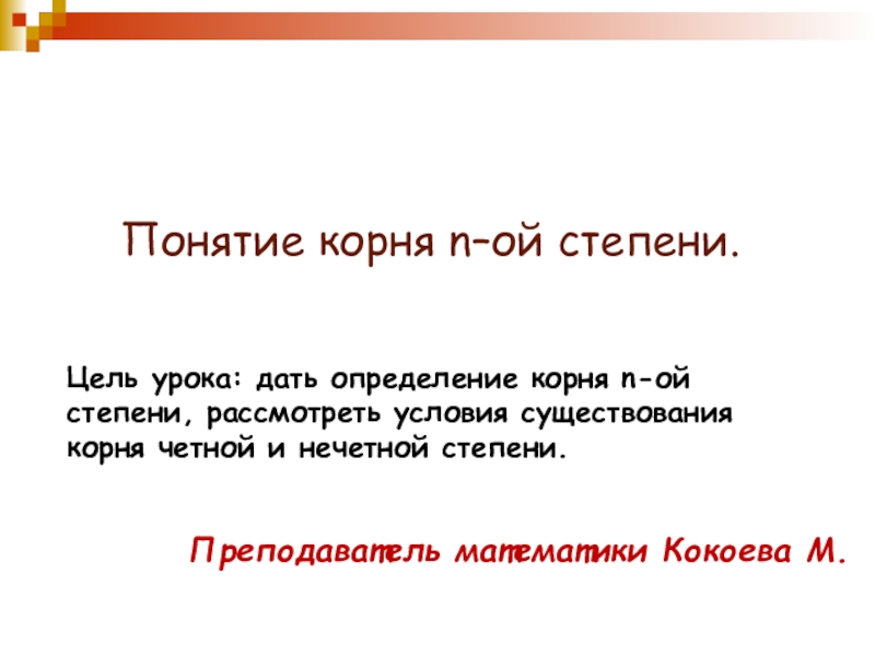 Понятие корня n–ой степени.Преподаватель математики Кокоева М.Цель урока: дать определение корня n-ой степени, рассмотреть условия существования корня четной и нечетной степени.