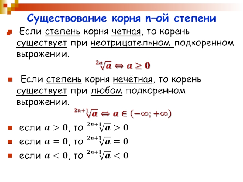 n-ой степени, рассмотреть условия существования корня четной и нечетной степени.