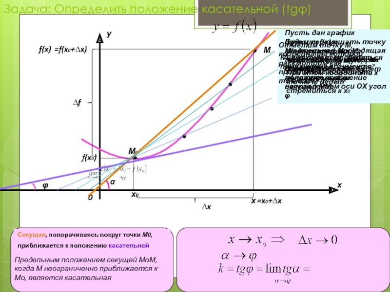 Будем перемещать точку М вдоль графика, приближая её к точке М0.Соответственно будет меняться положение секущей ММ0