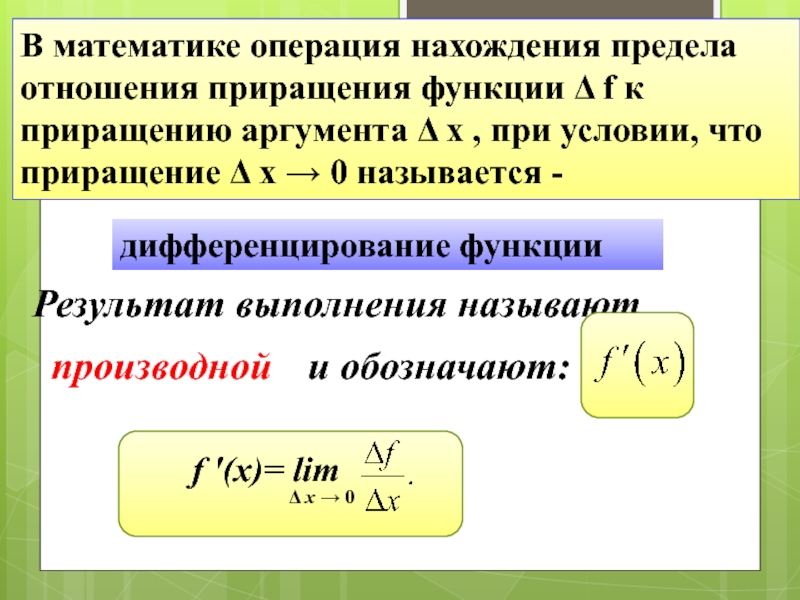 Т.е., значение функции изменилось на величину f(x)-f(x0)= f(x0 +∆x)-f(x0),КОТОРАЯ НАЗЫВАЕТСЯ ПРИРАЩЕНИЕМ ФУНКЦИИ И ОБОЗНАЧАЕТСЯ ∆f