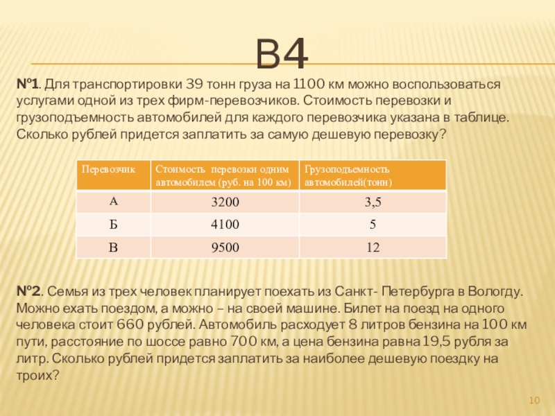 услугами одной из трех фирм-перевозчиков. Стоимость перевозки и грузоподъемность автомобилей для каждого перевозчика указана в таблице. Сколько рублей придется заплатить за самую дешевую перевозку?