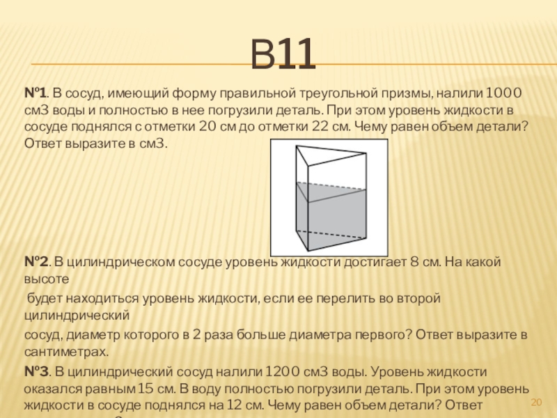 №1. В сосуд, имеющий форму правильной треугольной призмы, налили 1000 см3