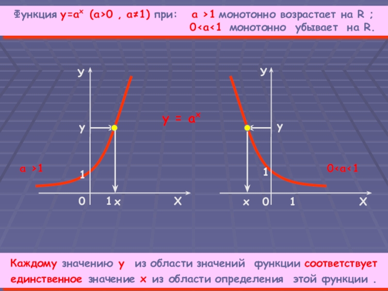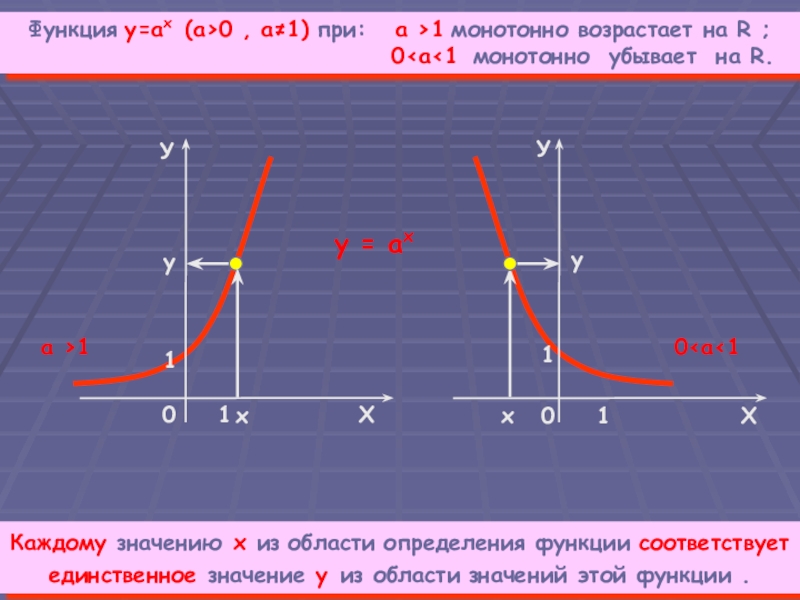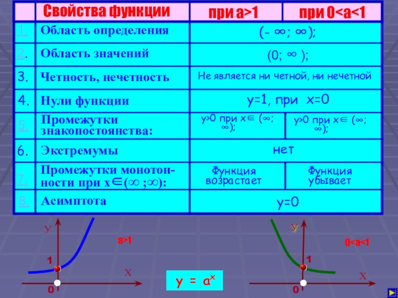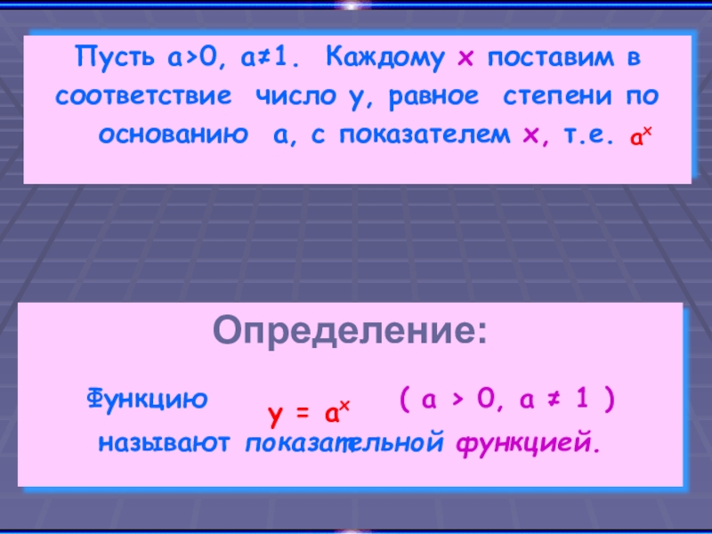 Пусть а>0, a≠1. Каждому x поставим в соответствие число у, равное степени по основанию а, с показателем x, т.е.