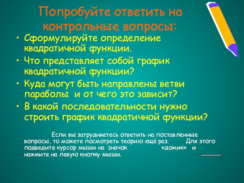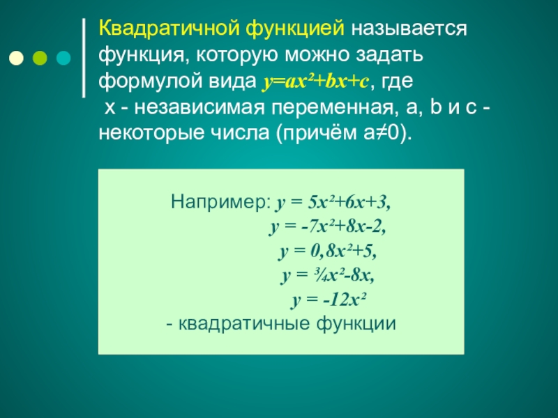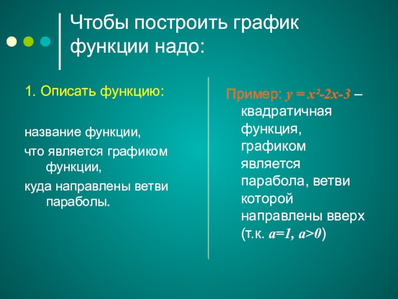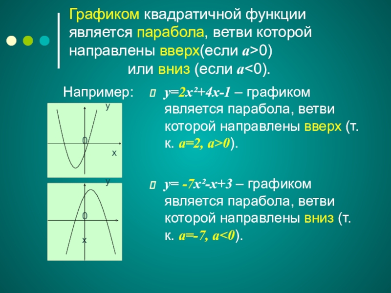 Пример: у = х²-2х-3 – квадратичная функция, графиком является парабола, ветви которой направлены вверх (т.к. а=1, а>0)