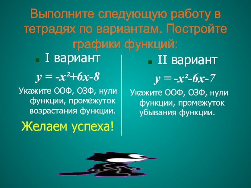 Укажите ООФ, ОЗФ, нули функции, промежуток убывания функции.