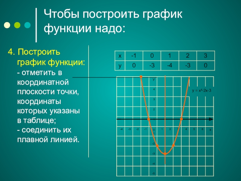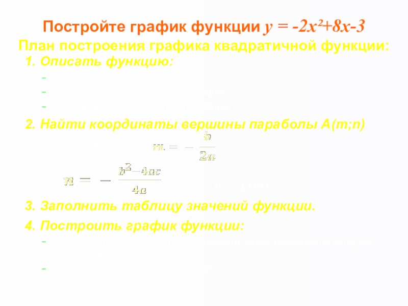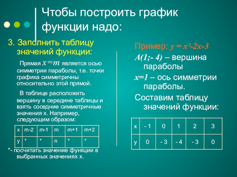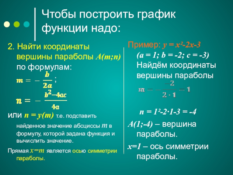 Пример: у = х²-2х-3 (а = 1; b = -2; с = -3) Найдём координаты вершины параболы