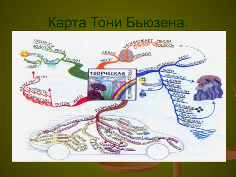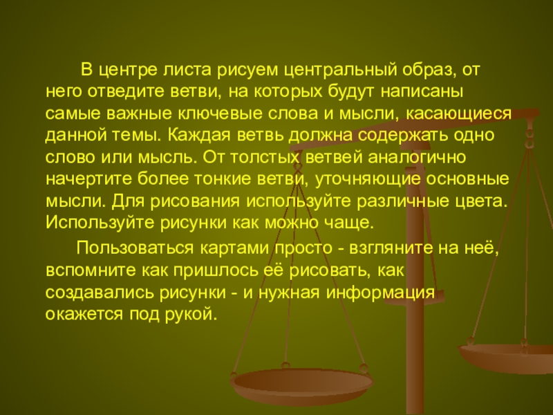 образ, от него отведите ветви, на которых будут написаны самые важные ключевые слова и мысли, касающиеся данной темы. Каждая ветвь должна содержать одно слово или мысль. От толстых ветвей аналогично начертите более тонкие ветви, уточняющие основные мысли. Для рисования используйте различные цвета. Используйте рисунки как можно чаще.