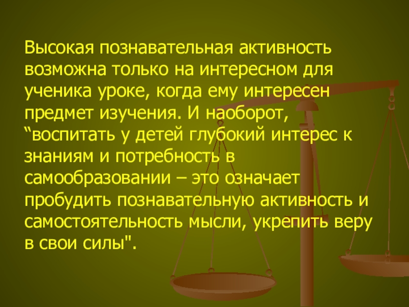 ему интересен предмет изучения. И наоборот, “воспитать у детей глубокий интерес к знаниям и потребность в самообразовании – это означает пробудить познавательную активность и самостоятельность мысли, укрепить веру в свои силы".