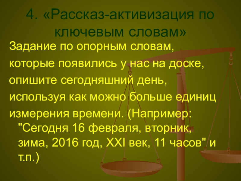 измерения времени. (Например: "Сегодня 16 февраля, вторник, зима, 2016 год, ХХI век, 11 часов" и т.п.)