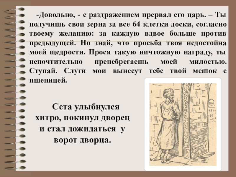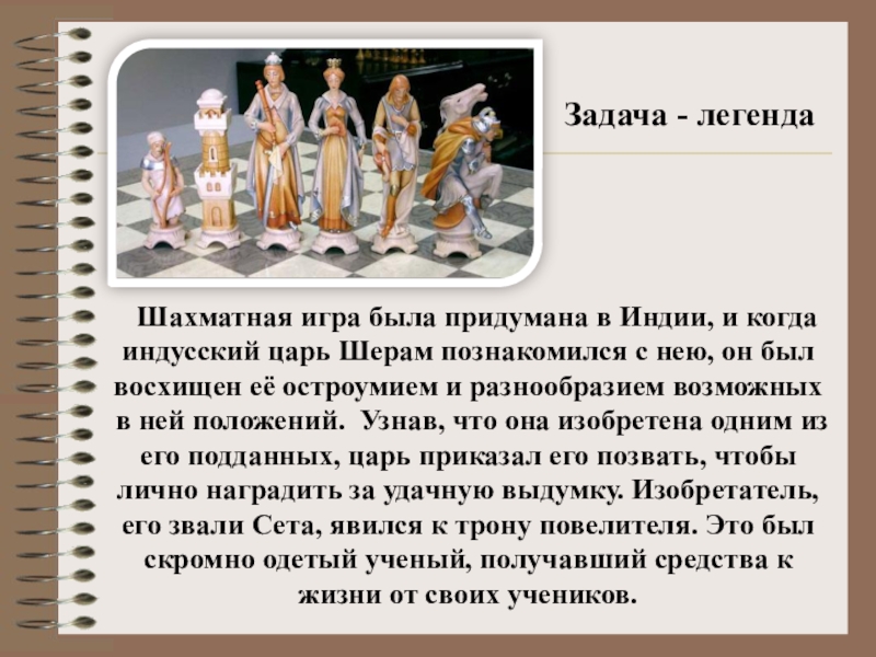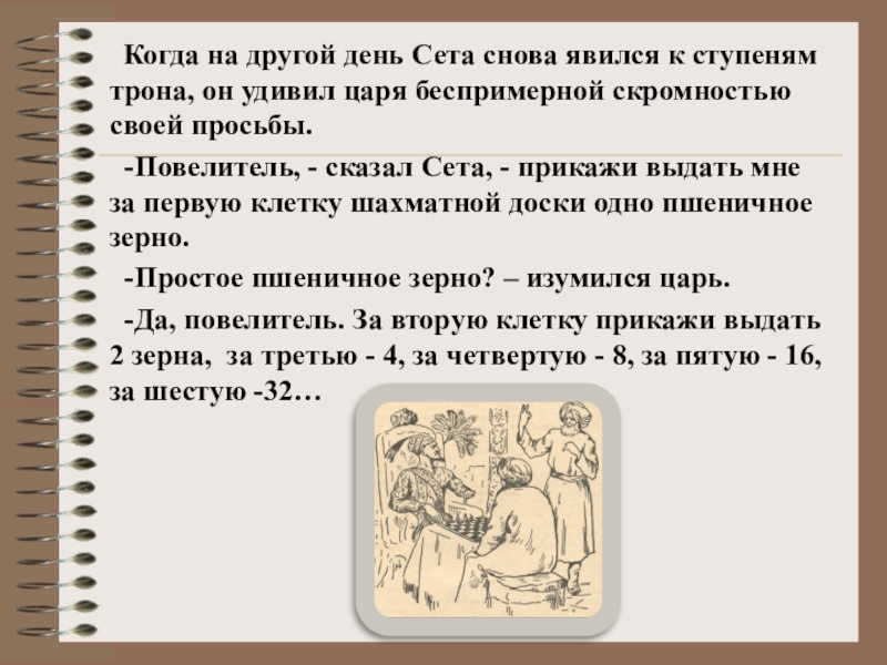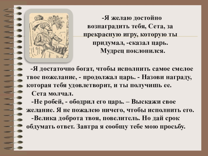 -Я желаю достойно вознаградить тебя, Сета, за прекрасную игру, которую ты придумал, -сказал царь.