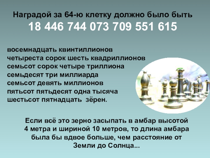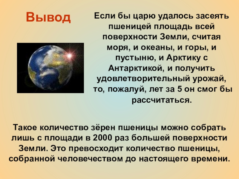 Такое количество зёрен пшеницы можно собрать лишь с площади в 2000 раз большей поверхности Земли. Это превосходит количество пшеницы, собранной человечеством до настоящего времени.