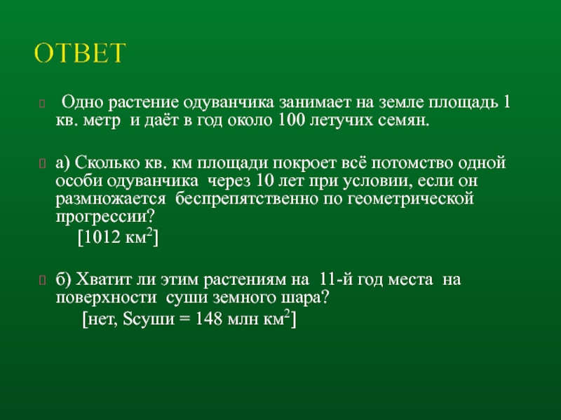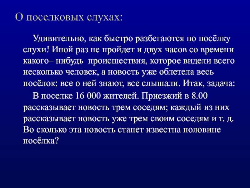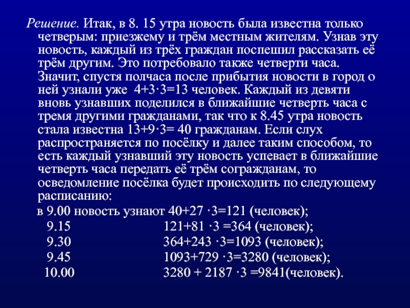приезжему и трём местным жителям. Узнав эту новость, каждый из трёх граждан поспешил рассказать её трём другим. Это потребовало также четверти часа. Значит, спустя полчаса после прибытия новости в город о ней узнали уже 4+3·3=13 человек. Каждый из девяти вновь узнавших поделился в ближайшие четверть часа с тремя другими гражданами, так что к 8.45 утра новость стала известна 13+9·3= 40 гражданам. Если слух распространяется по посёлку и далее таким способом, то есть каждый узнавший эту новость успевает в ближайшие четверть часа передать её трём согражданам, то осведомление посёлка будет происходить по следующему расписанию: