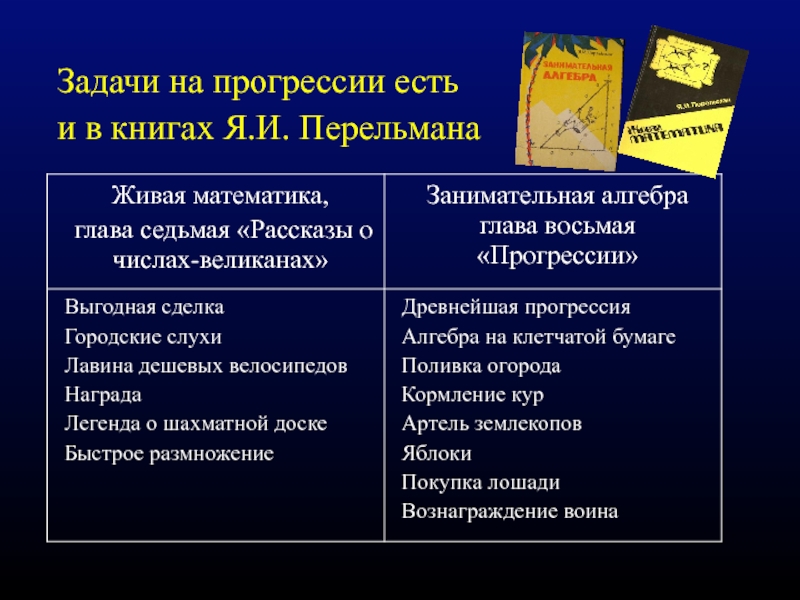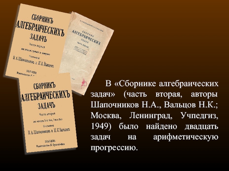 Нашли много задач на арифметическую и геометрическую прогрессию в старых и в современных учебниках по математике. Заметили, что арифметическая прогрессия в практических задачах встречается чаще геометрической. Много задач с практическим содержанием в учебнике для 9 класса под редакцией Г.В. Дорофеева [4].