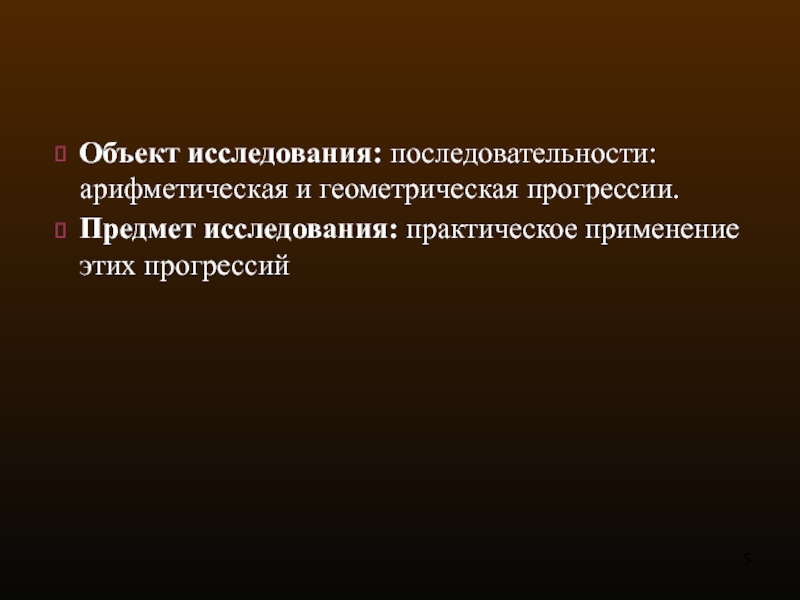 Слайд 5Объект исследования: последовательности: арифметическая и геометрическая прогрессии.