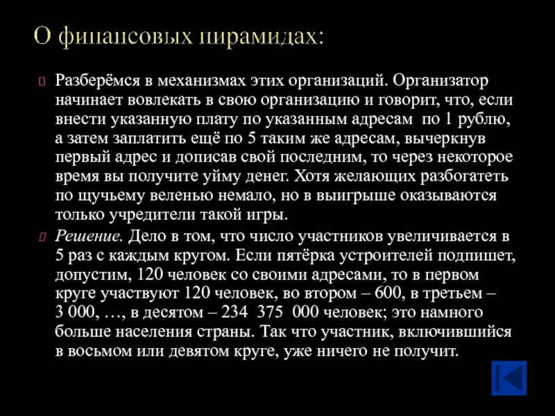 Решение. Дело в том, что число участников увеличивается в 5 раз с каждым кругом. Если пятёрка устроителей подпишет, допустим, 120 человек со своими адресами, то в первом круге участвуют 120 человек, во втором – 600, в третьем – 3 000, …, в десятом – 234 375 000 человек; это намного больше населения страны. Так что участник, включившийся в восьмом или девятом круге, уже ничего не получит.
