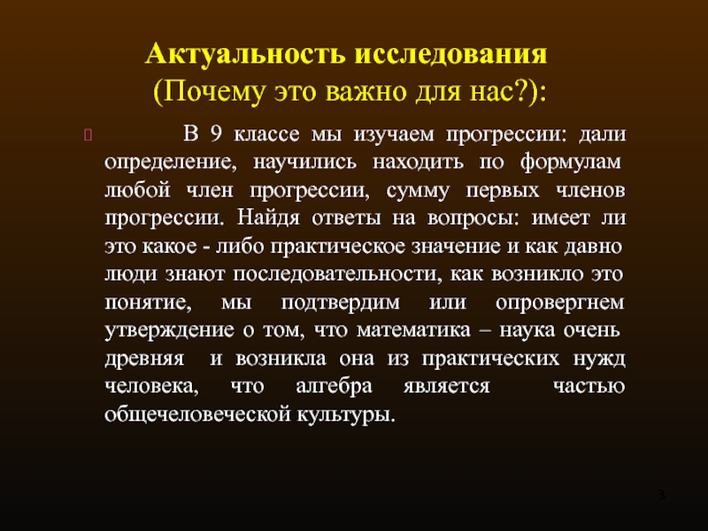 определение, научились находить по формулам любой член прогрессии, сумму первых членов прогрессии. Найдя ответы на вопросы: имеет ли это какое - либо практическое значение и как давно люди знают последовательности, как возникло это понятие, мы подтвердим или опровергнем утверждение о том, что математика – наука очень древняя и возникла она из практических нужд человека, что алгебра является частью общечеловеческой культуры.