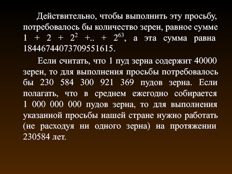 Если считать, что 1 пуд зерна содержит 40000 зерен, то для выполнения просьбы потребовалось бы 230 584 300 921 369 пудов зерна. Если полагать, что в среднем ежегодно собирается 1 000 000 000 пудов зерна, то для выполнения указанной просьбы нашей стране нужно работать (не расходуя ни одного зерна) на протяжении 230584 лет.