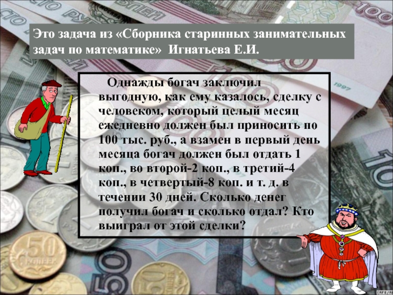 с человеком, который целый месяц ежедневно должен был приносить по 100 тыс. руб., а взамен в первый день месяца богач должен был отдать 1 коп., во второй-2 коп., в третий-4 коп., в четвертый-8 коп. и т. д. в течении 30 дней. Сколько денег получил богач и сколько отдал? Кто выиграл от этой сделки?