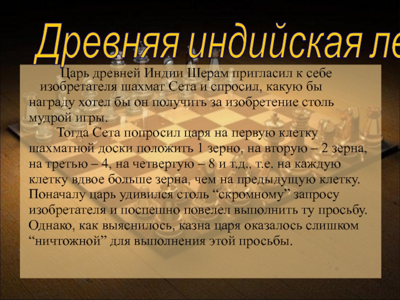 шахматной доски положить 1 зерно, на вторую – 2 зерна,