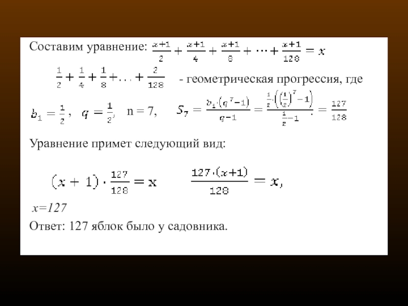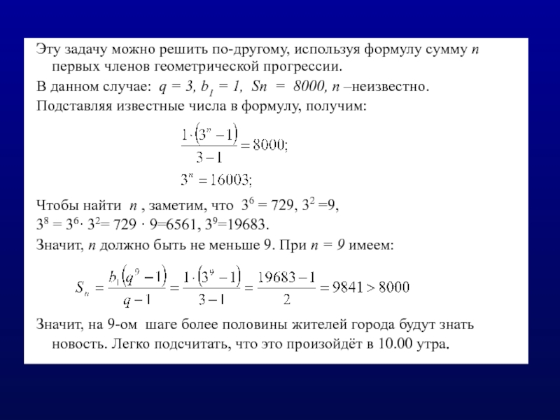 В данном случае: q = 3, b1 = 1, Sn = 8000, n –неизвестно.