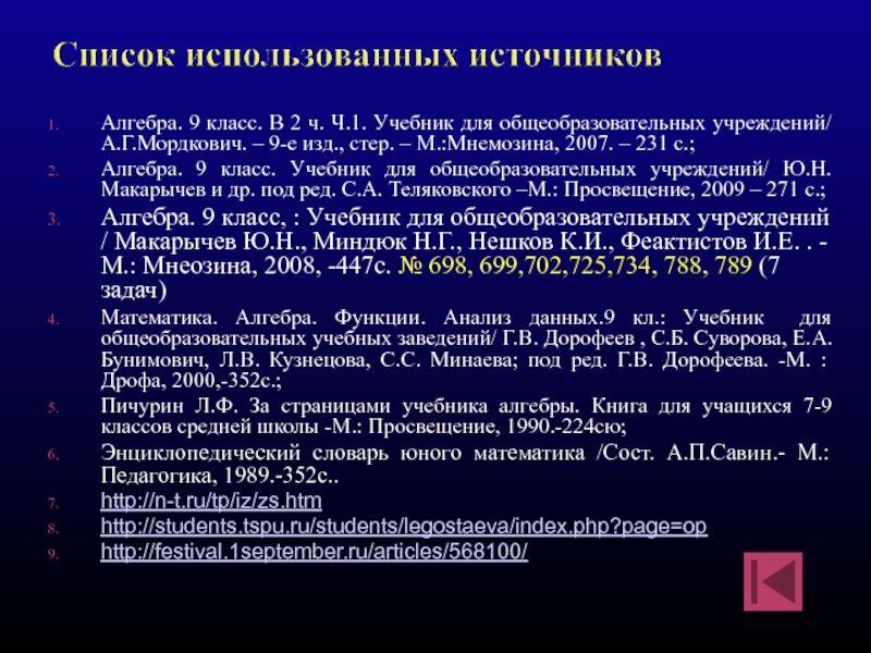 Алгебра. 9 класс. Учебник для общеобразовательных учреждений/ Ю.Н. Макарычев и др. под ред. С.А. Теляковского –М.: Просвещение, 2009 – 271 с.;