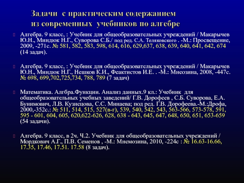 Алгебра. 9 класс, : Учебник для общеобразовательных учреждений / Макарычев Ю.Н., Миндюк Н.Г., Нешков К.И., Феактистов И.Е. . -М.: Мнеозина, 2008, -447с. № 698, 699,702,725,734, 788, 789 (7 задач)