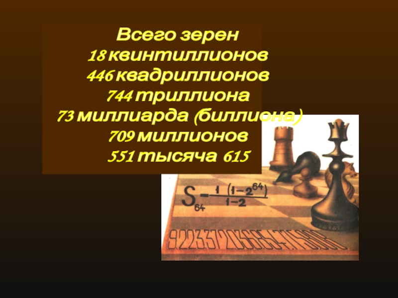 количество зерен, равное сумме 1 + 2 + 22 +.. + 263, а эта сумма равна 18446744073709551615.