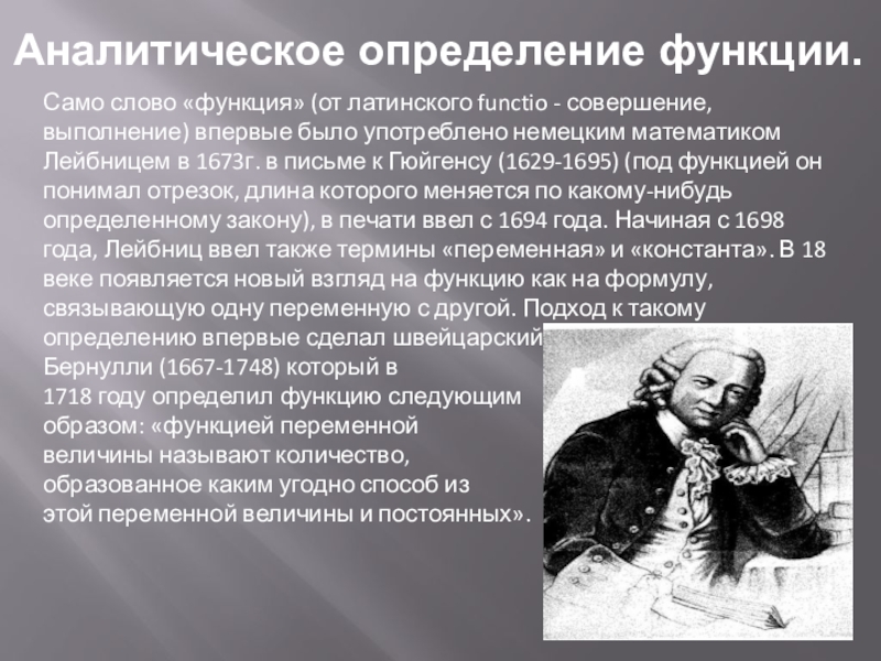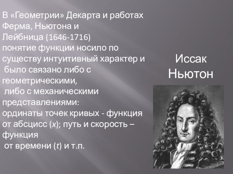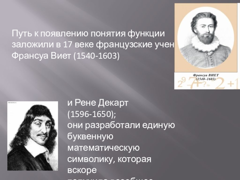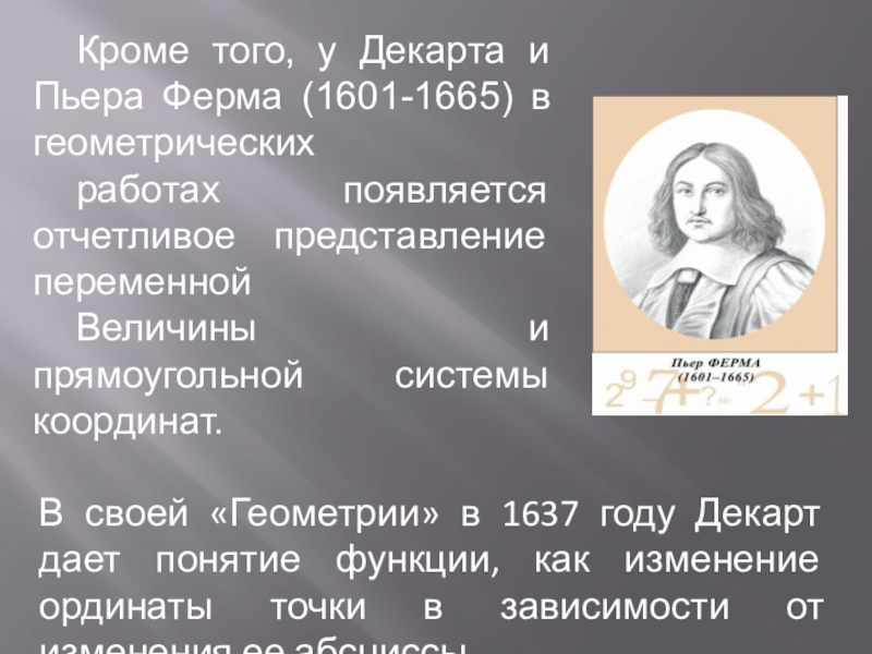 В своей «Геометрии» в 1637 году Декарт дает понятие функции, как изменение ординаты точки в зависимости от изменения ее абсциссы