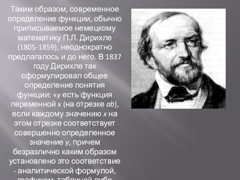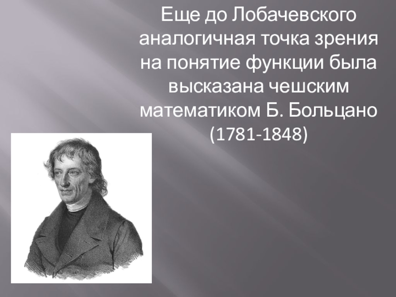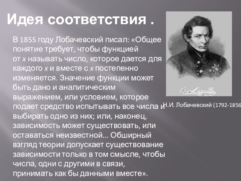 В 1855 году Лобачевский писал: «Общее понятие требует, чтобы функцией от x называть число, которое дается для каждого x и вместе с x постепенно изменяется. Значение функции может быть дано и аналитическим выражением, или условием, которое подает средство испытывать все числа и выбирать одно из них; или, наконец, зависимость может существовать, или оставаться неизвестной... Обширный взгляд теории допускает существование зависимости только в том смысле, чтобы числа, одни с другими в связи, принимать как бы данными вместе».