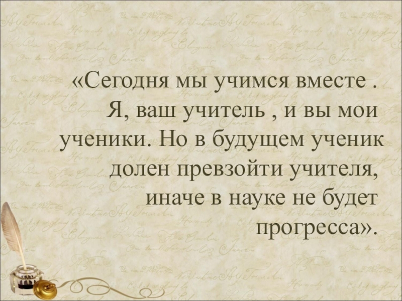 вы мои ученики. Но в будущем ученик долен превзойти учителя, иначе в науке не будет прогресса».
