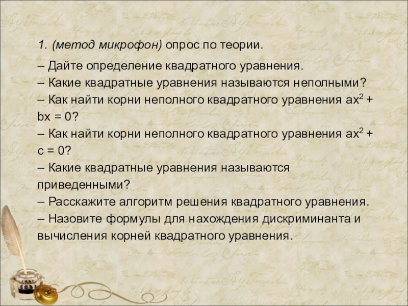 – Дайте определение квадратного уравнения.