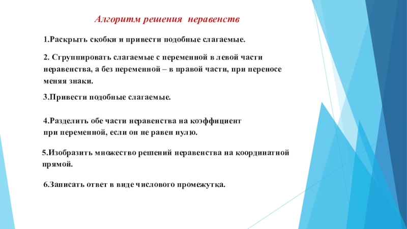 4.Разделить обе части неравенства на коэффициент при переменной, если он не равен нулю.