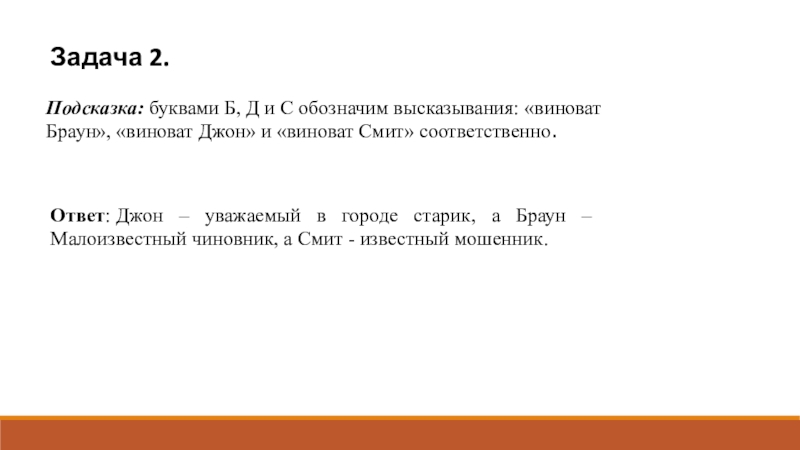Ответ: Джон – уважаемый в городе старик, а Браун – Малоизвестный чиновник, а Смит - известный мошенник.