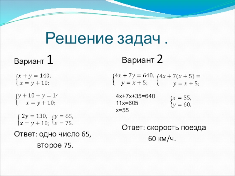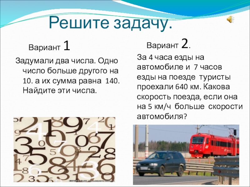 Вариант 2. За 4 часа езды на автомобиле и 7 часов езды на поезде туристы проехали 640 км. Какова скорость поезда, если она на 5 км/ч больше скорости автомобиля?
