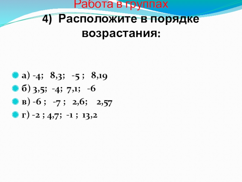 Слайд 11 Работа в группах 4) Расположите в порядке возрастания: