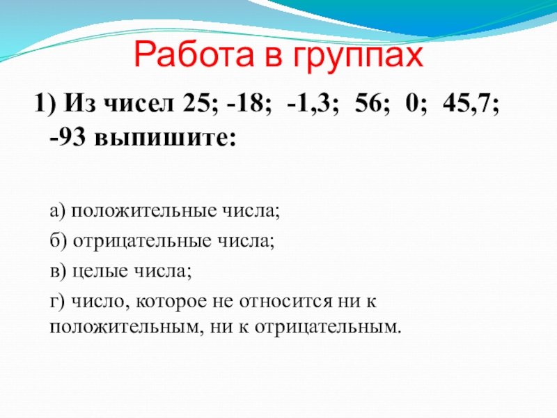 Работа в группах 1) Из чисел 25; -18; -1,3; 56; 0; 45,7; -93 выпишите:  а) положительные